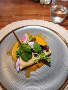 Octopus Marinated in Axiote, Peanut Mole and Plantain Chochoyotas